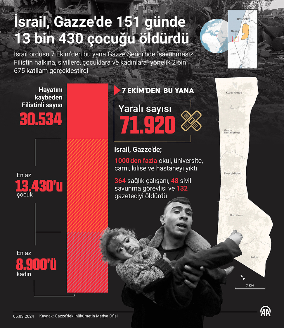 Gazze'deki Filistin Sağlık Bakanlığı Sözcüsü Eşref el-Kudra, yaptığı yazılı açıklamada, Gazze kentindeki Şifa Hastanesinde yetersiz beslenme ve susuzluk nedeniyle 15 yaşındaki bir çocuğun hayatını kaybettiğini belirtti.