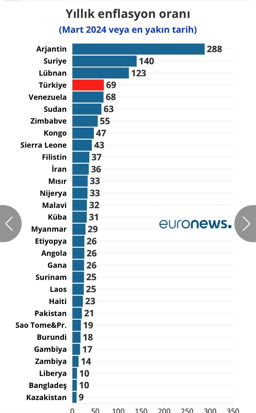 Peki, dünyada en yüksek enflasyon hangi ülkelerde? Enflasyon sıralamasında Türkiye dünyada ve Avrupa’da kaçıncı sırada yer alıyor? Trading Economics sitesi ülkelerin açıkladığı son enflasyon verilerini kapsıyor. Verilerin çoğu Mart 2024 ve Şubat 2024’ten oluşuyor.