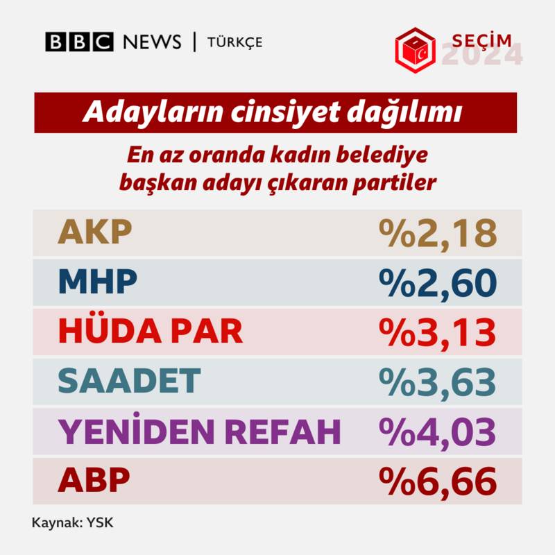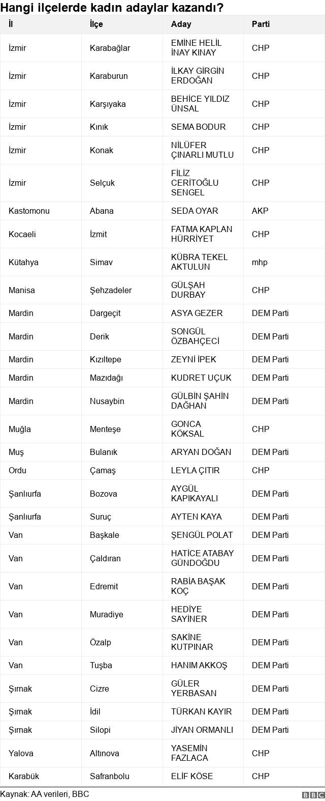 2019 yerel seçimlerinde 4 kadın belediye başkanı seçilmişti. CHP 32 isimle en fazla kadın belediye başkanı çıkarırken, DEM Parti'den 31 belediye başkanı seçildi. AKP ise il ve ilçelerde 8 kadın belediye başkanı çıkardı. Bunlardan biri büyükşehir belediye başkanı oldu. Türkiye genelindeki oy oranlarına göre seçimi üçüncü sırada bitiren YRP hiç kadın aday çıkarmazken, MHP'den sadece bir aday seçildi. Kadın belediye başkanı çıkaran büyükşehirler Aydın, Diyarbakır, Eskişehir, Gaziantep ve Tekirdağ oldu. Afyonkarahisar, Ağrı, Batman, Bilecik, Edirne ve Siirt'te de seçimleri kadın adaylar kazandı.