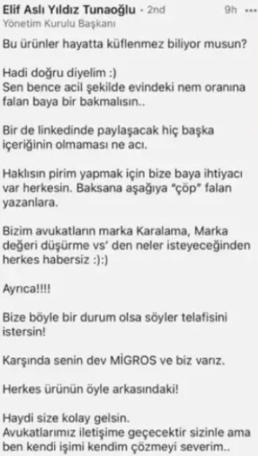 Elif Aslı Yıldız Tunaoğlu, paylaşımın altına; “Bu ürünler hayatta küflenmez biliyor musun? Hadi doğru diyelim. Sen bence acil şekilde evindeki nem oranına falan baya bir bakmalısın. Bir de Linkedin'de paylaşacak hiç başka içeriğinin olmaması ne acı. Haklısın prim yapmak için bize baya ihtiyacı var herkesin.Baksana aşağıya "çöp" falan yazanlara. Bizim avukatların marka Karalama, Marka değeri düşürme vs'den isteyeceğinden herkes habersiz. Ayrıca! Bize böyle bir durum olsa söyler telafisini istersin. Karşında senin dev Migros ve biz varız. Herkes ürünün öyle arkasındaki. Haydi size kolay gelsin. Avukatlarımız iletişime geçecektir sizinle ama ben kendi işimi kendim çözmeyi severim" diye yazarken, verdiği yanıt sosyal medyada tepki topladı.