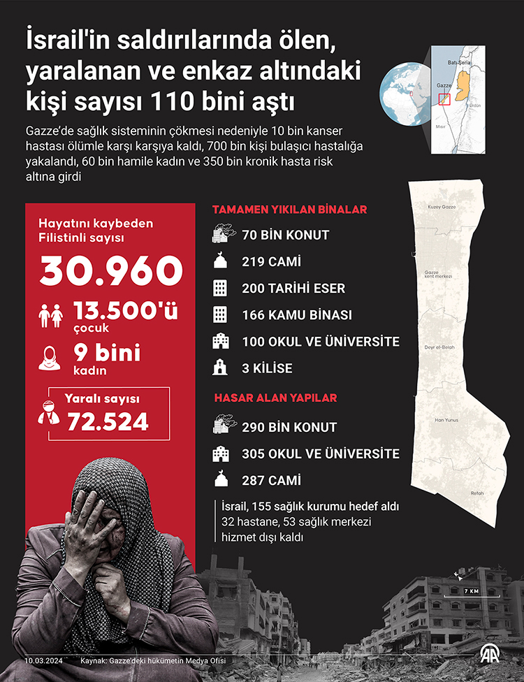 İsrail güçleri, halkı zorla aç ve susuz bırakarak büyük bir insani felakete yol açtığı Gazze'ye saldırılarına 157. gününde de devam ediyor. Filistin resmi ajansı WAFA'nın haberine göre, İsrail ordusu gece boyu hava, kara ve denizden başta Gazze Şeridi'nin güneyindeki Han Yunus ile Gazze kentindeki Zeytun Mahallesi olmak üzere çeşitli noktalara yoğun saldırılar düzenledi. İsrail savaş uçaklarının Zeytun Mahallesi'nde bir evi bombalaması sonucu ölen ve yaralananlar oldu.